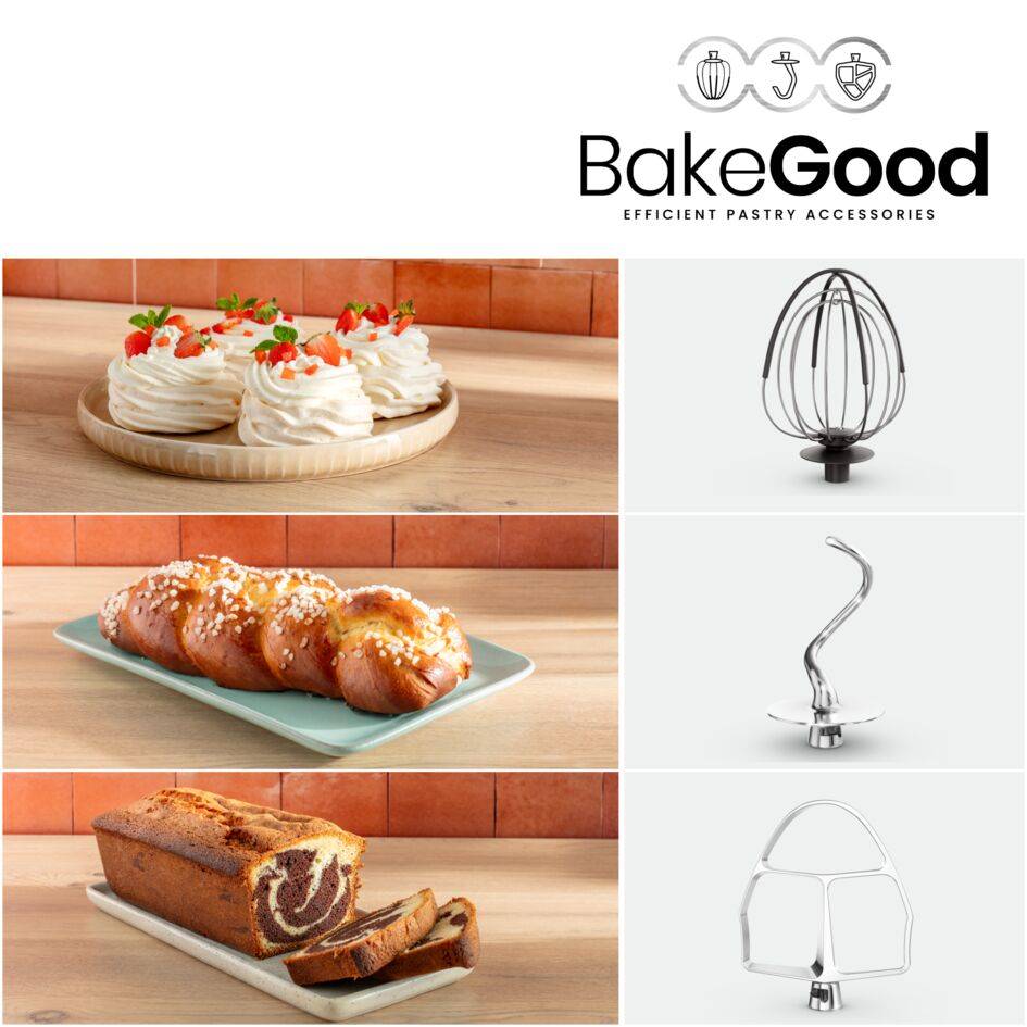 Avec notre nouveau kit d'accessoires BakeGood, réussissez vos créations sucrées et salées en toute simplicité : les pâtisseries, cookies, pâtes à tarte, pains et pizzas maison n'auront plus de secret pour vous. Ce kit d'accessoires polyvalent a été conçu pour vous permettre de reproduire les gestes experts des pâtissiers professionnels depuis le confort de votre maison. Régalez amis, famille et vous-même avec Bake Partner et ses nombreux accessoires, pour des recettes réussies à chaque fois.