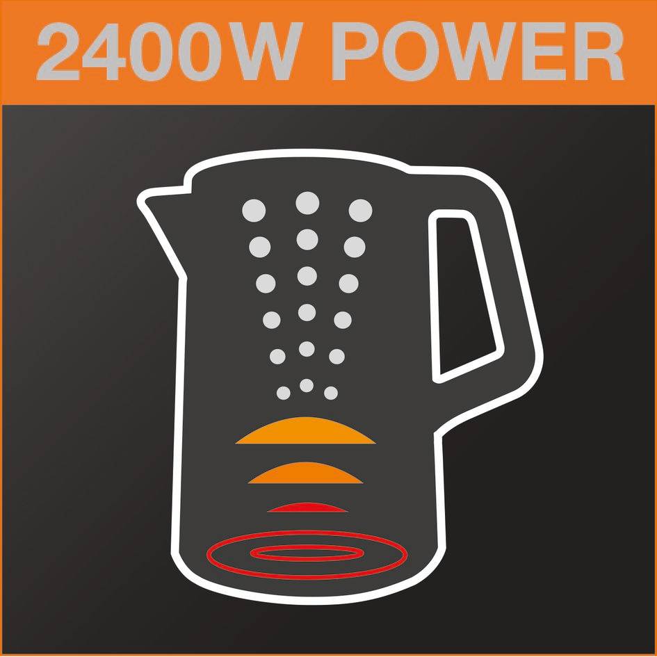 Bouilloire sans fil de 1,7 L avec base rotative à 360° Puissance de 2 400 W pour une ébullition ultra-rapide Couvercle à ouverture automatique Deux indicateurs de niveau d'eau Filtre à eau amovible pour un nettoyage facile Témoin lumineux de marche/arrêt avec arrêt automatique pour plus de sécurité
