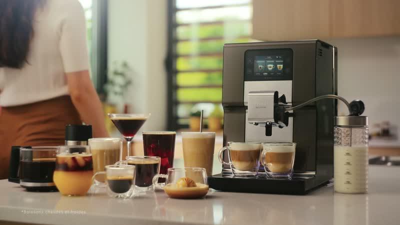36 recettes chaudes et froides pour une préparation simple de toutes vos boissons à la maison, du café nitro au latte glacé en passant par l'affogato Technologie Cold Brew Aroma pour des cafés et lattes glacés incroyables avec une pré-infusion à chaud pour un maximum d'arômes et de saveurs Machine espresso entièrement automatique très intuitive dotée d'un écran tactile couleur pour un accès direct à toutes vos boissons Deux tasses à la fois (café ou boisson lactée) en appuyant simplement sur l'écran pour un véritable gain de temps Système One Touch Cappuccino pour faire mousser le lait facile à nettoyer pour des boissons lactées parfaites Machine à café automatique avec une fonction dédiée aux boissons à emporter incluant 8 recettes, parfaitement adaptées à votre mug de voyage Nettoyage en profondeur 100 % automatique (aucun démontage), 0 % d'effort