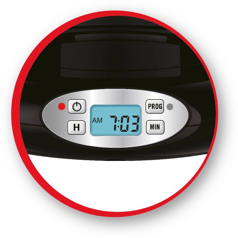 Une machine à café filtre facile d’utilisation avec programmation 24 heures Grande capacité compacte de 0,9 l pour 12 tasses de café fraîchement préparé La verseuse isotherme conserve le café à une température idéale pendant 4 heures Système anti-goutte pour servir le café pendant que la cafetière est en fonctionnement