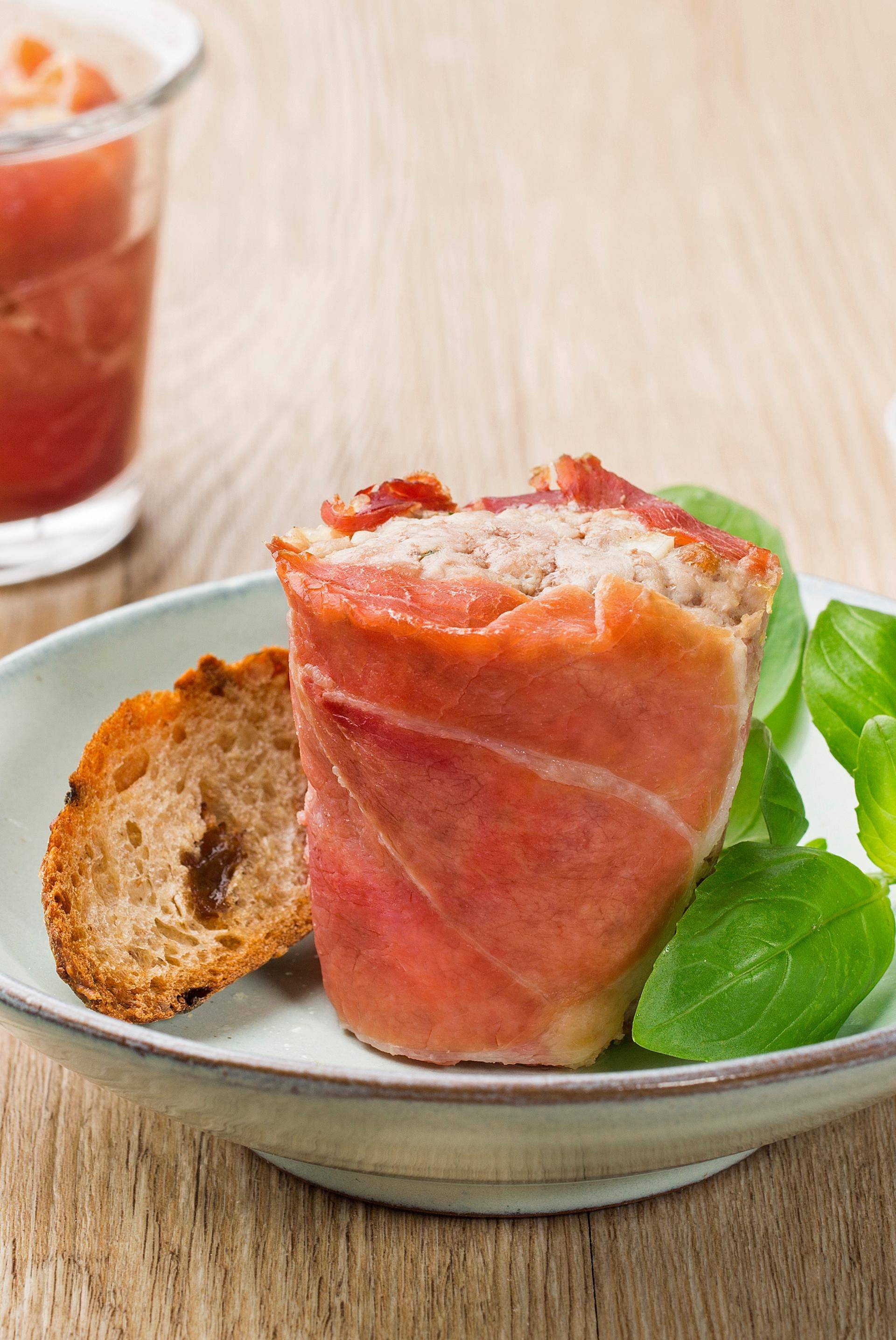 Chemiser les verrines avec la moitié du jambon. Hacher le reste de jambon avec le veau et le porc.