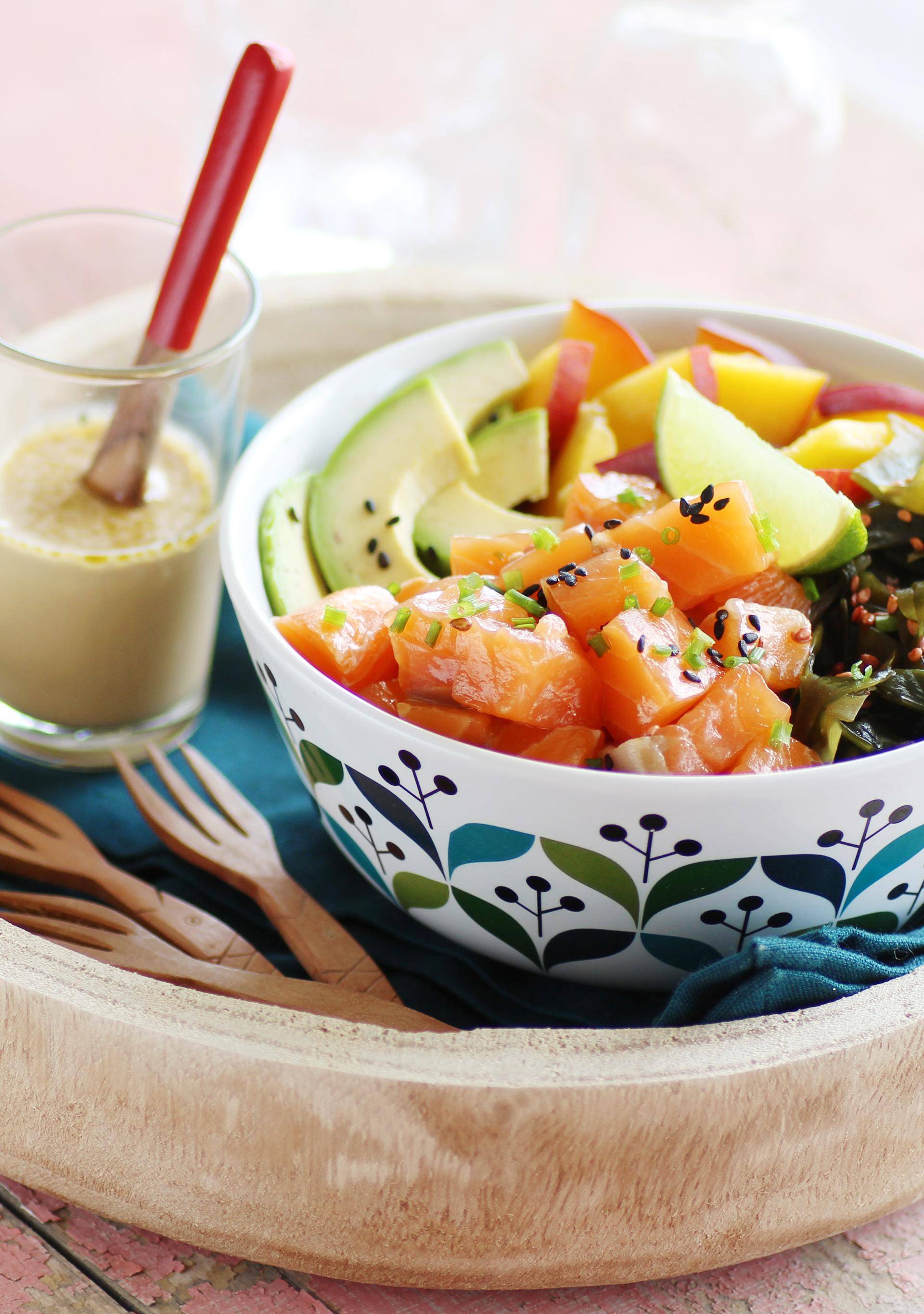 Garnissez avec le saumon, l'avocat, les nectarines, les graines de sésame et les algues.