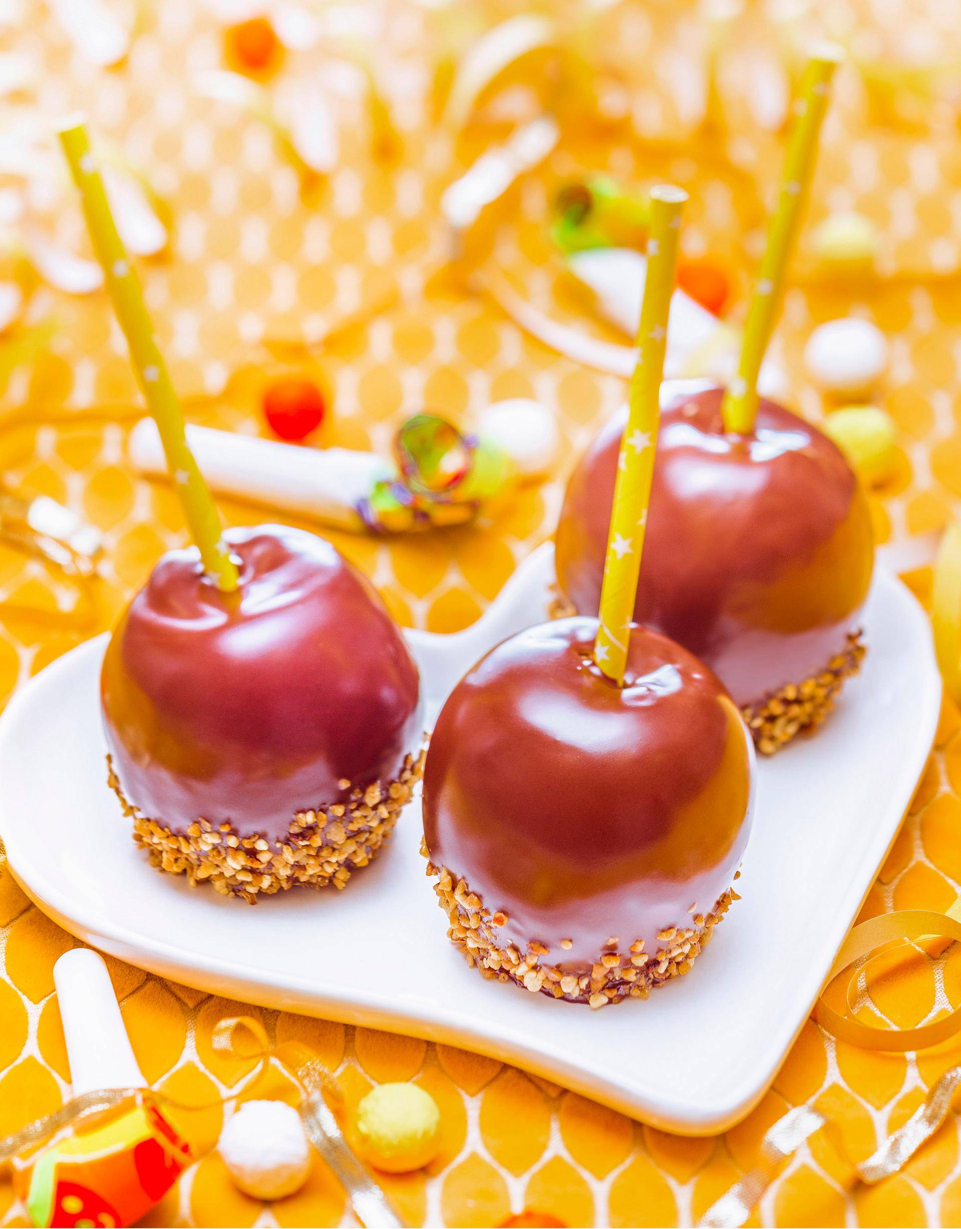 Trempez le dessus de chaque pomme dans le pralin. Posez les pommes sur le papier sulfurisé.