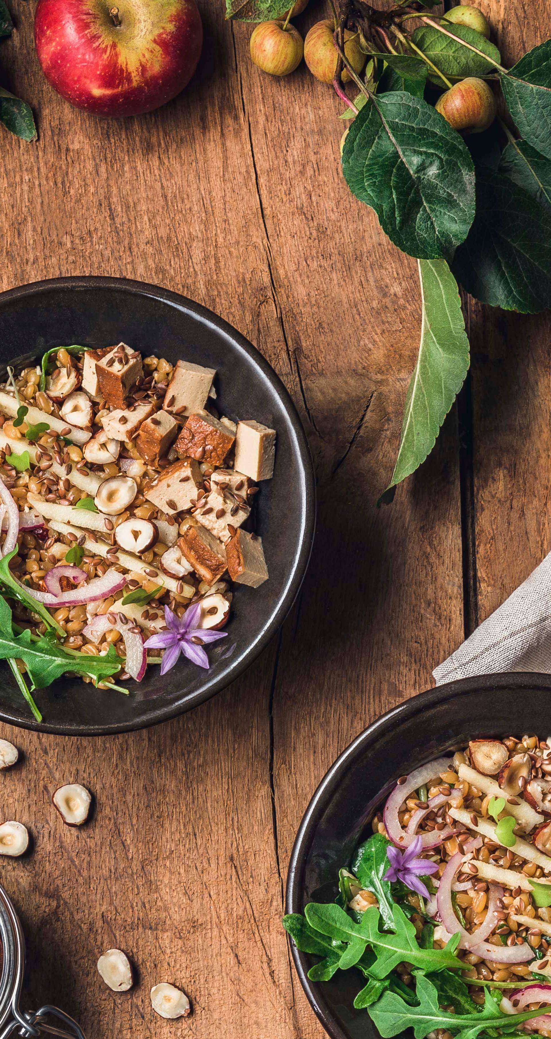 Dans un saladier, mélangez le petit épeautre, les noisettes, la roquette lavée et séchée, l'oignon pelé et émincé, les pommes et le tofu fumé coupé en dés. Assaisonnez, mélangez et réservez au frais le temps de préparer la sauce.