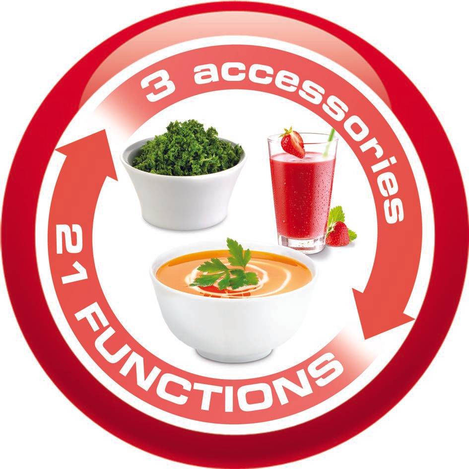 - Een uitgebreid gamma kwalitatieve opzetstukken: beker van 800 ml, een garde en een hak/snij-apparaat van 500 ml!