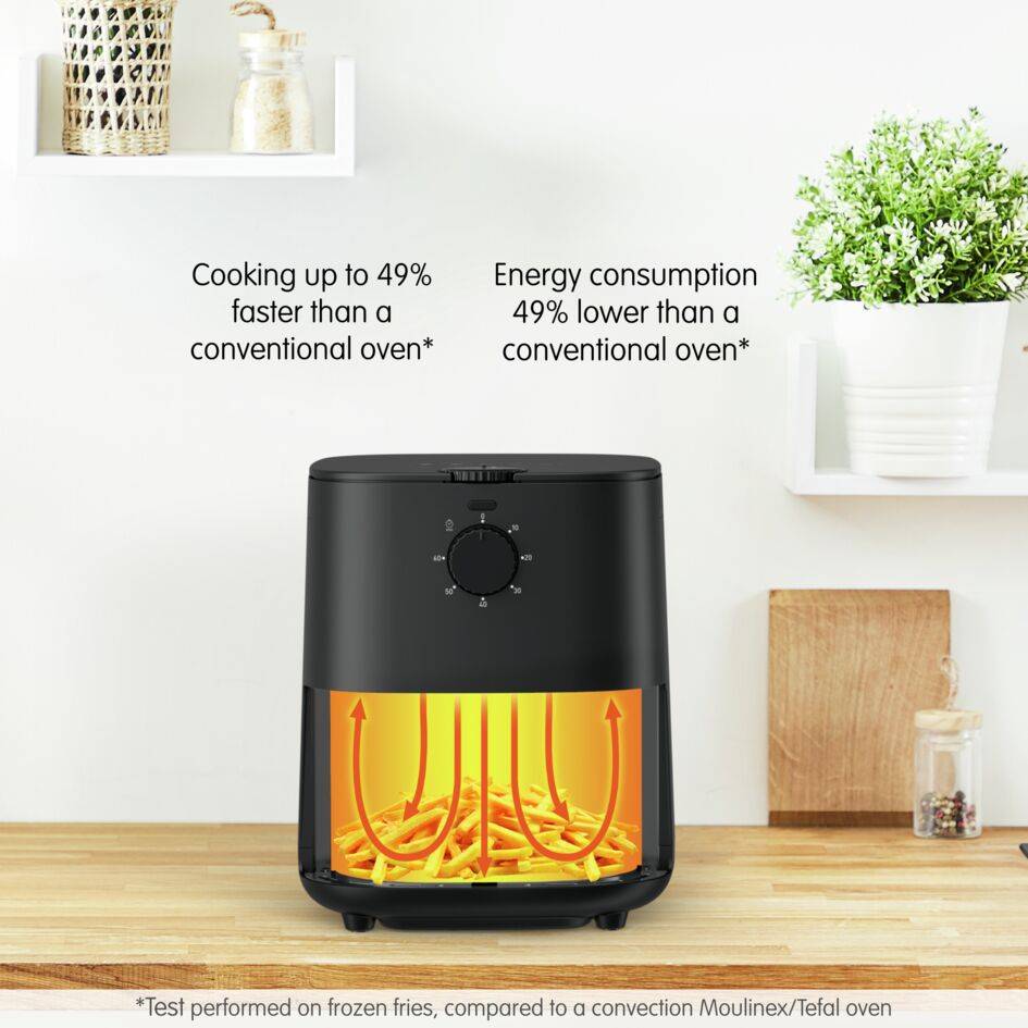 SNEL EN ZUINIG: Kies voor snelle en gemakkelijke kookresultaten en bespaar meer dan 50% energie in vergelijking met een standaard oven* (*49% minder energie nodig dan een standaard oven. Test uitgevoerd met 600 ml diepvriesfrietjes, in vergelijking met de Moulinex convectieoven.) VEELZIJDIG: Een veelzijdige air fryer ontworpen om al je favoriete recepten te bereiden - van perfect knapperige frietjes en gebraden kip tot groenten en zelfs desserts HETELUCHTTECHNOLOGIE: Gezond frituren kan met deze air fryer: krokant goudbruin gebakken resultaten zonder of met een minimum aan toegevoegde olie én met 99% minder toegevoegde vetten* (*600 g verse frietjes met 7 ml olie vergeleken met traditioneel frituren met 2 l olie) VAATWASSERBESTENDIGE ONDERDELEN: Uitgerust met een vaatwasserbestendig mandje met anti-aanbaklaag voor een eenvoudige schoonmaak en een stressvrije kookervaring 15 JAAR HERSTELGARANTIE: We bieden 15 jaar herstelgarantie, inclusief een snelle en goedkope service via 6.500 herstelcentra wereldwijd, en focussen ons zo op een zuinigere en milieugerichte aanpak PRECISIESTANDEN: Nauwkeurig instelbare temperatuurregeling en timer - tot 200°C en 60 minuten - zorgen voor perfecte resultaten, zodat je iedere kookuitdaging aankunt. RUIMTEBESPAREND ONTWERP: Ontdek deze compacte, ruimtebesparende hetelucht friteuse met een inhoud van 3,5 liter, perfect voor gezonde maaltijden voor 2 tot maximaal 4 personen