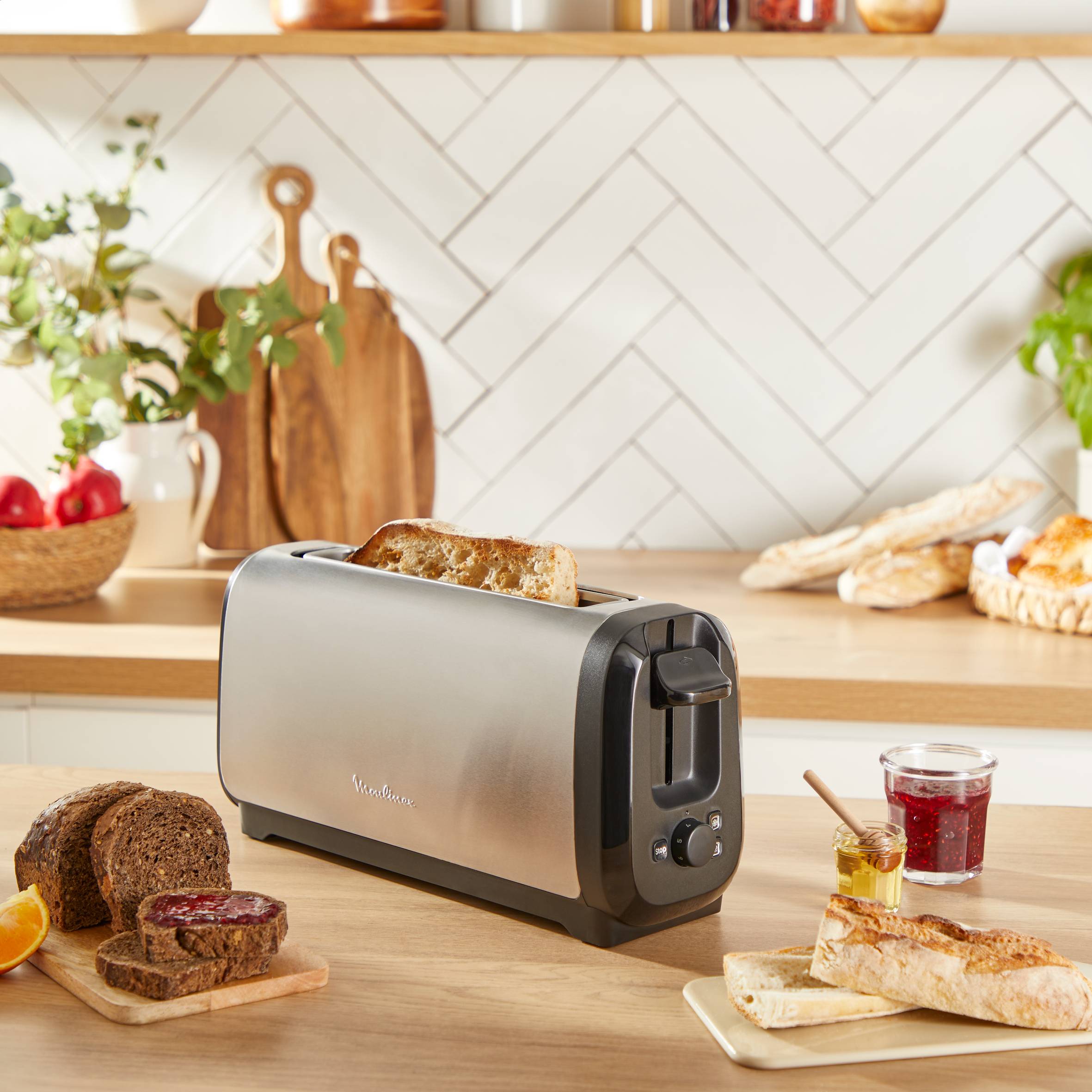 Je Subito, broodrooster met lange sleuven, sneller roosteren, energiebesparend, zwart en inox kit