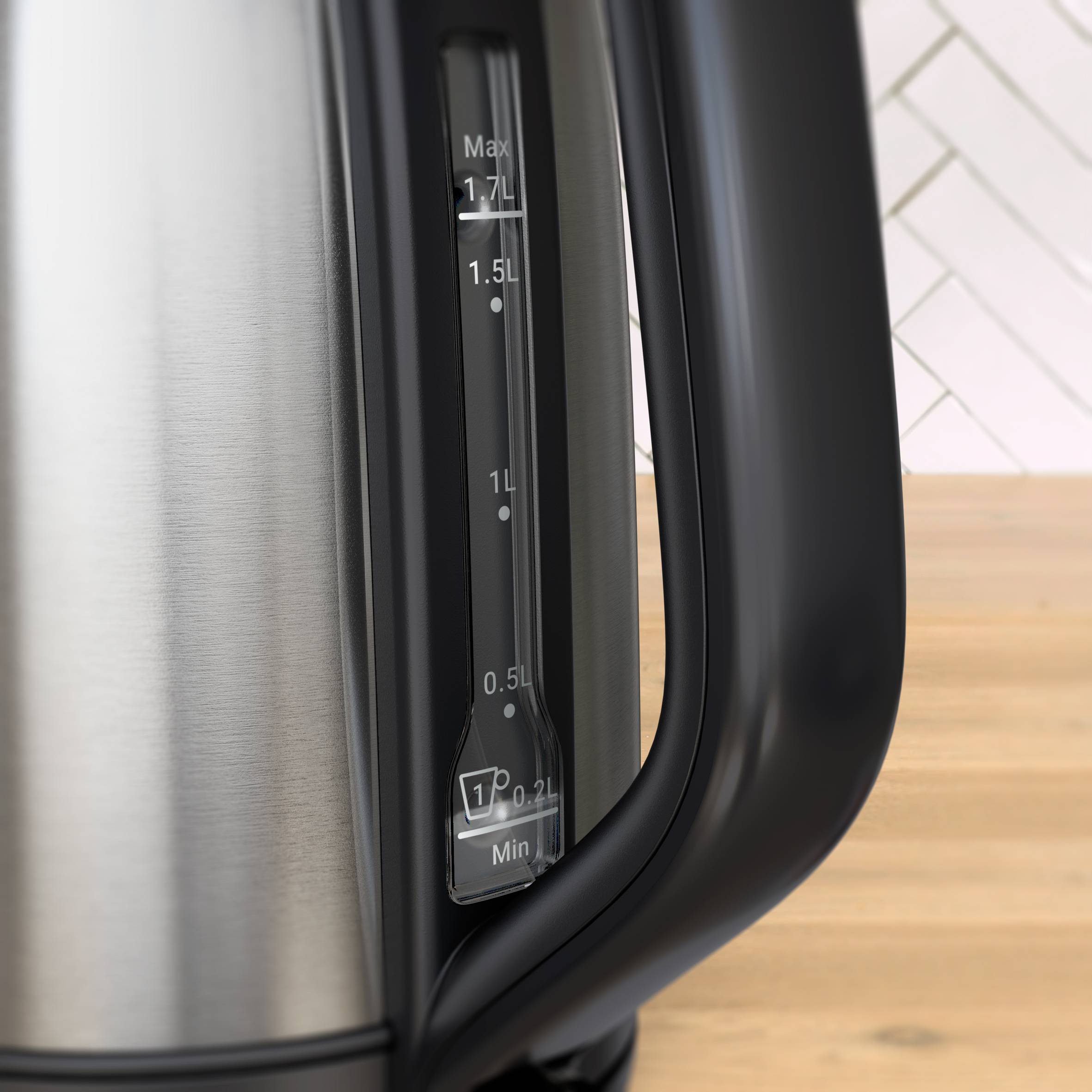 Geniet tot 2 keer sneller* van je kopje thee dankzij de éénkopsaanduiding (*vgl. met 600 ml koken) Automatisch met één hand te openen door een eenvoudige druk op de knop – ideaal voor gemakkelijk vullen en schoonmaken Waterkoker met een strak, modern design dat stijl toevoegt aan je keuken Gemakkelijk schoon te maken, uitneembaar antikalkfilter, voor schoner water en beter smakende thee en koffie Elektrische waterkoker met een ruime inhoud van 1,7 liter, ideaal voor het bereiden van 7 kopjes en perfect voor al je familie en vrienden 2400 W vermogen voor snel opwarmen en hete dranken in een handomdraai - ideaal als je het 's ochtends druk hebt Een handige 360° draaibare basis om je waterkoker gemakkelijk vanuit elke hoek op te pakken en neer te zetten De kartonnen verpakking van onze producten is recycleerbaar